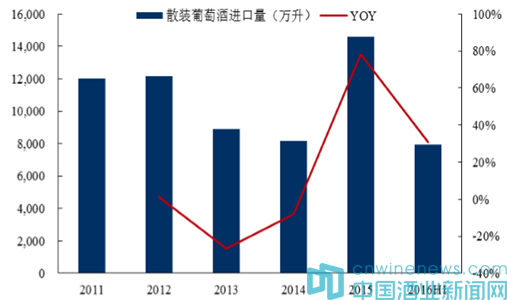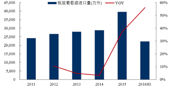 2016上半年,葡萄酒進口量為31.2萬千升,同比+20.5%;進口額為14.5億美元,同比+18.2%;平均價格為4.64美元/升,同比下降1.9%。進口酒市場份額以進口量計算為達到37.8%,較去年同期提升3pct左右。