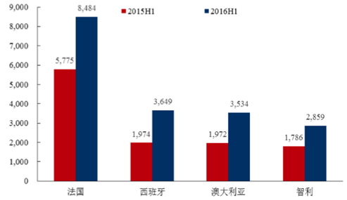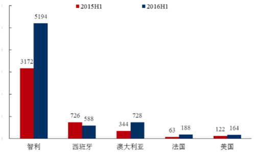 2016年上半年,散裝酒進口量7.9萬千升,維持31.1%的高速增長,均價則從15年的0.68美元/升略下降至0.65美元/升。散裝酒主要進口來源國中,智利占比達65.5%。智利在2015年初實施零關稅的影響持續,2016H1國內進口智利散裝葡萄酒量達5194萬升,同比大增64%,均價0.58美元/升。而相較西班牙低價葡萄酒,澳大利亞、美國和法國均價在1美元/升以上的葡萄酒進口量增長較快。