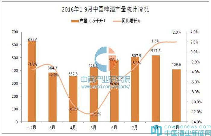 據中商產業研究院大數據庫顯示:2016年9月中國啤酒產量為409.6萬千升,同比增長2.0%。2016年1-9月中國啤酒產量為3714.2萬千升,同比下降4.4%。