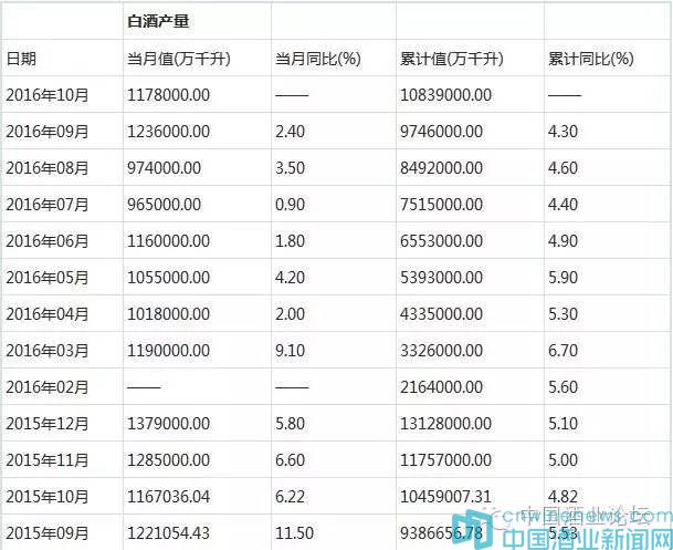 以下為2015年9月至2016年10月我國白酒產量統計: