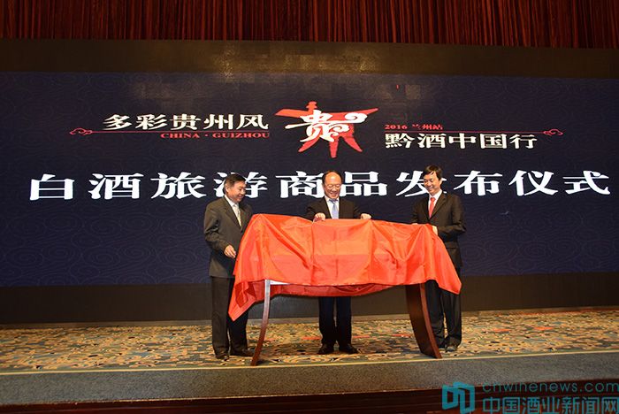 ▲貴州省政協副主席、省工商聯主席李漢宇、省經濟和信息化委員會主任馬寧宇、貴州省旅游發展委員會紀檢組長胡曉剛共同為貴州白酒旅游商品揭幕。