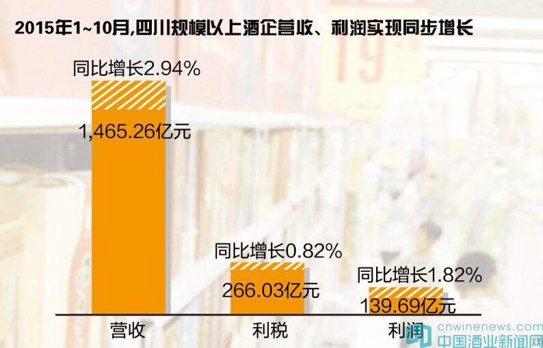 四川省經濟和信息化委員會副主任王萬錕表示,2015年1至10月,四川規模以上酒企346家營收1,465.26億元,同比增長2.94%;實現利稅266.03億元,同比增長0.82%;利潤總額139.69億元,同比增長1.82%。其中,五糧液2015年1月~9月實現營業收入151.31億元,同比增長0.42%,歸屬于上市公司股東的凈利潤46.03億元。