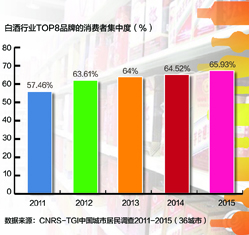 中國城市居民調查數據顯示:2011年至2012年間,提升速度最為顯著,前8個品牌覆蓋到的白酒消費者從57.46%上升至63.61%,一年之中提升了6.15個百分點。2012年至2014年3年中,提升速度有所減緩,以每年約0.5個百分點的速度爬升。而在過去一年中,品牌集中度的上升速度又有所加快,截至2015年4月,白酒品牌TOP8能夠覆蓋到的消費者比例達到65.92%,相比2014年同期上升了1.41個百分點。