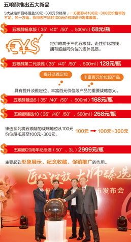 對于五糧醇推出5大戰(zhàn)略新品,田常春指出,五糧醇原有產(chǎn)品主要承載著五糧液100元價格帶的戰(zhàn)略地位,雖然價位覆蓋70元~180元價格帶,但是主要戰(zhàn)場在100元以下;而隨著五糧醇臻選6和臻選10的推出,彌補了100元~300元價位帶的空白,將五糧醇的戰(zhàn)略地位從100元價位段拓展至100元~300元。
