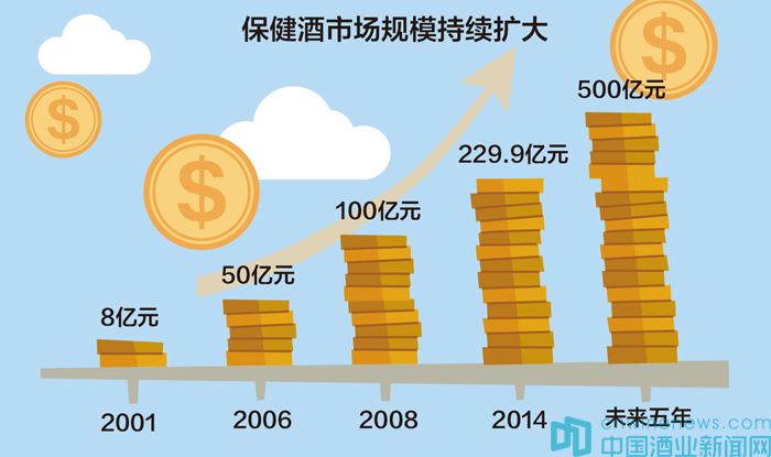 而且從相關數據來看,健康養生酒是國內發展最快的酒種,成長空間巨大。僅就其中的保健酒而言,2001年,中國保健酒行業只有約8億元的規模;2006年,其規模成長便突破了50億元;2008年,便突破了100億元大關;而到了2014年,全國保健酒市場的規模已增至約229.9億元。