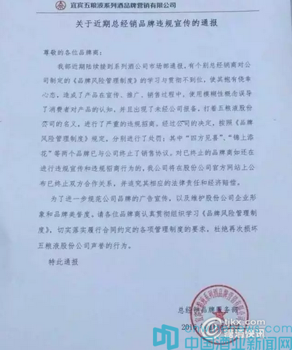 文件稱,有個別總經銷商對《品牌風險管理制度》的學習與貫徹不到位,使其抱有僥幸心態,造成了產品的宣傳、推廣、銷售過程中,使用模糊性概念誤導消費者對產品的認知,并且出現了未經公司報備,打著五糧液股份公司的名義,進行了嚴重的違規招商。