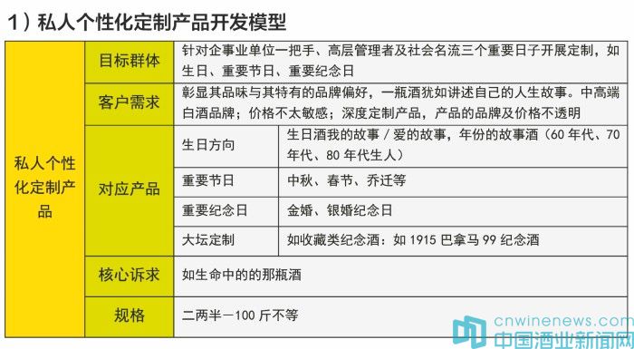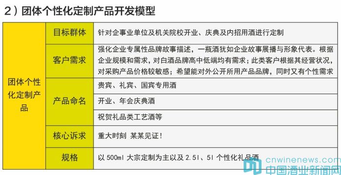 定制化產品首先以群族特色完成市場突破,如茅臺定位國酒定制與飛天茅臺群體相對應,從而實現品牌化、市場化,進而打造超級產品、超級品系。定制型產品想要在市場上取得突破性增長,關鍵在于如何圍繞目標群族定位,開展私人個性化定制、宴席個性化定制和團體個性化定制產品市場的開發,主要開發模型如下: