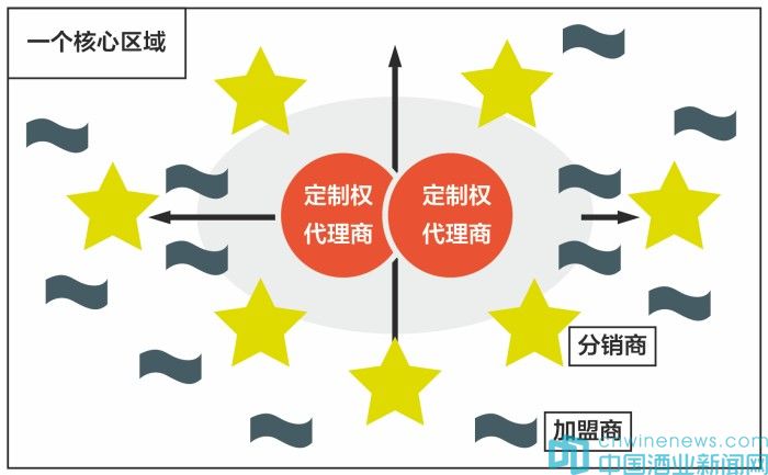 最終形成,一個核心輻射區,1~2個定制權代理商,1~2個定制文化體驗館,多個定制權分銷商的定制渠道矩陣。以定制權限的分封,深度挖潛,帶來定制酒銷量的裂變。