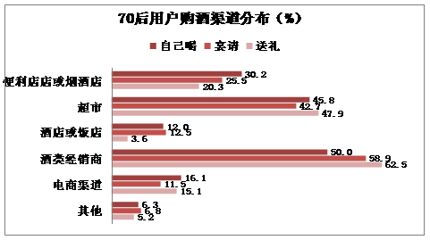 6、70后消費者在酒類經銷商處買酒的比例最高,其次是超市和便利店/煙酒店。