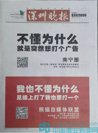 這不禁讓我想起前段時間,“南寧圈”和熊貓自媒體聯盟聯合在深圳晚報的頭版打廣告,廣告語也是很任性。“不懂為什么打廣告”一夜之間火爆網絡,段子手和P圖大神們紛紛出手,于是我們看到了趕來湊熱鬧的王老吉和加多寶、魅族和OPPO、杰士邦和杜蕾斯……