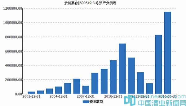在近三個報告季,茅臺的“蓄水池”一直越蓄越滿。2015年末,預收賬款較期初增長4倍至82.62億元。2016年一季度末,這一數據再增加近3億元上升至85.45億元。