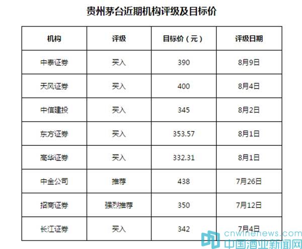 “名酒繼續復蘇,市場無風險利率持續下行,優質資產重估,茅臺值得給予高估值,我們認為未來一年茅臺合理區間在336—400元(PE20—25倍),我們繼續給予年內目標價350元,目前300元的股價,可以確定性買入。”招商證券分析師董廣陽、楊勇勝如此認為。