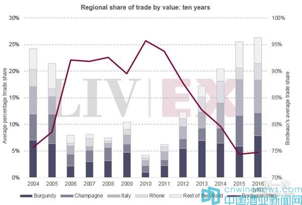 在交易所上,經(jīng)常有來自世界不同各地的葡萄酒進(jìn)行交易;今年已包括了新西蘭、黎巴嫩和智利等優(yōu)質(zhì)葡萄酒。如下圖所示,它們所屬的“世界其它酒區(qū)”組別,在最近幾年的市場份額已有所上升。