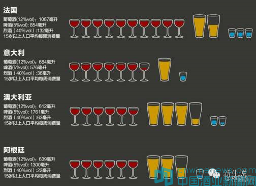 作為與法國鄰家的德國,風格卻截然相反,幾乎是世界人均消費啤酒最高的國家,15歲以上的人口平均每周消費2330毫升的啤酒。澳大利亞、新西蘭、加拿大、美國、南非等國家均以消費啤酒為主。