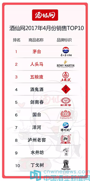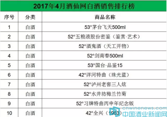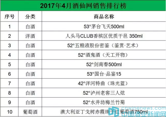 根據(jù)酒仙網(wǎng)發(fā)布的4月份整體銷售排行,共有8款白酒、1款葡萄酒、1款洋酒上榜,53°茅臺(tái)飛天酒、人頭馬CLUB香檳區(qū)優(yōu)質(zhì)干邑350ml、52°五糧液股份密鑒(鑒賞·藝術(shù))分列前三。