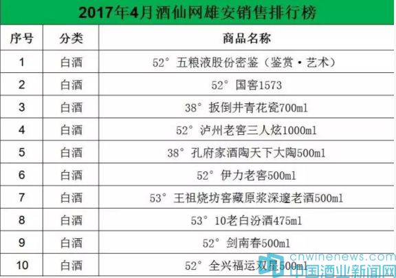 日前酒仙網(wǎng)發(fā)布了四月酒類銷售排行榜和雄安新區(qū)酒類銷售排行。榜單顯示,茅臺(tái)、人頭馬、五糧液位列酒仙網(wǎng)4月銷售排行榜前三名,而在大熱的雄安新區(qū)方面,五糧液、國窖1573、扳倒井位列榜單前三。