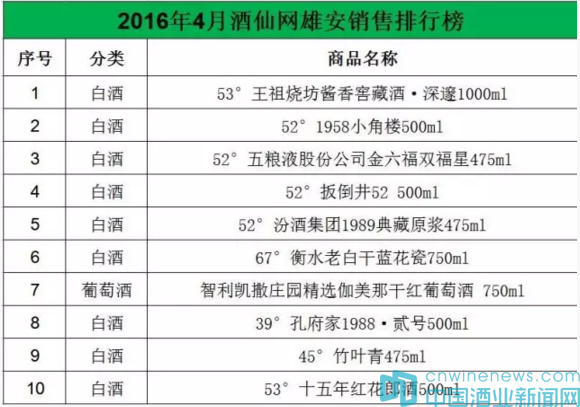 酒仙網(wǎng)同期發(fā)布了2016年4月酒仙網(wǎng)雄安銷售排行榜。對比來看,兩期入榜10款產(chǎn)品全部發(fā)生了變化,顯示了短短時(shí)間之內(nèi),雄安新區(qū)酒類消費(fèi)已發(fā)生巨大變化。