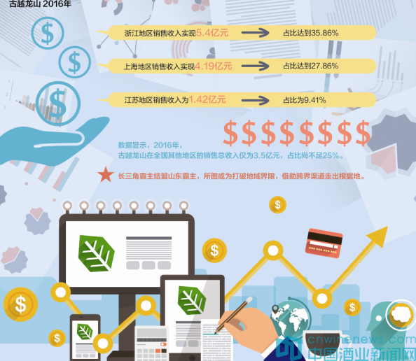 作為魯酒的領頭羊,業內估計景芝酒業2016年收入20億元以上,領跑魯酒陣營。4月25日,浙江古越龍山紹興酒股份有限公司發布了2016年度報告,報告期內,古越龍山實現營業收入15.35億元,比上年同期增長11.58%;實現利潤總額1.64億元。
