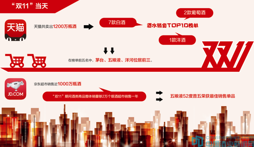 以酒類而言,11月11日當天,京東超市銷售近1000萬瓶酒,“雙11”期間酒類商品整體銷量夠2萬個煙酒超市銷售一年,五糧液52度普五榮獲最佳銷售單品。