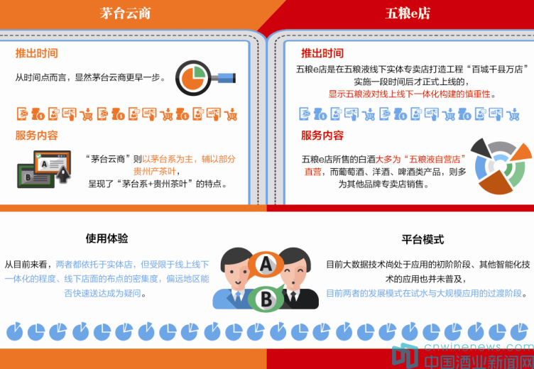 從時間點而言,顯然茅臺云商更早一步,但是值得注意的是,五糧e店是在五糧液線下實體專賣店打造工程“百城千縣萬店”實施一段時間后才正式上線的,顯示五糧液對線上線下一體化構建的慎重性。