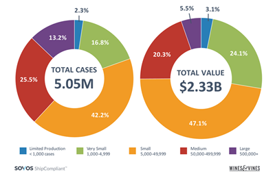不同規模的酒廠在葡萄酒直銷航運市場和整體市場中所占的市場份額有所不同。雖然美國三大酒廠的葡萄酒產量占總產量的60%,但小型酒廠在直銷市場中占主導地位。簡單來說,小型酒廠(年產量5000~49999箱的酒廠)占直銷總額的47.1%,占直銷總量的42.2%;更小的酒廠(年產量1000~4999箱的酒廠)排第二位,占直銷總額的24.1%,占直銷總量的16.8%;中型酒廠(年產量50000~49999箱的酒廠)占直銷總量的25.5%,但直銷額僅占20.3%;大型酒廠(年產量超過500000箱的酒廠)的發貨量占13.2%,直銷額僅占5.5%;而限量生產的酒廠(小于1000箱)的發貨量占2.3%,直銷額占3.1%。