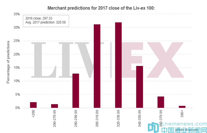 平均來(lái)說(shuō),受訪者預(yù)計(jì)行業(yè)基準(zhǔn)的Liv-ex 100指數(shù)今年將上漲7.9%,收于320.6點(diǎn);這表示市場(chǎng)將連續(xù)第二年會(huì)出現(xiàn)強(qiáng)勁增長(zhǎng)。