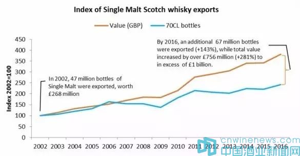 2、2016年蘇格蘭單一麥芽威士忌出口總值持續(xù)增長,并首次突破10億英鎊出口總值。