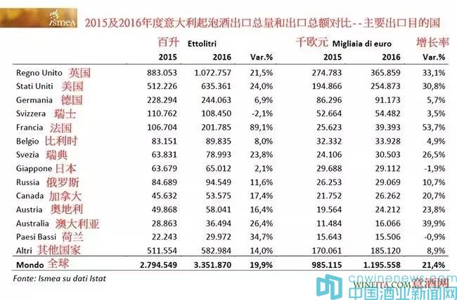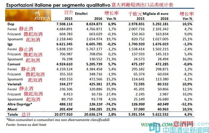從上圖的2015及2016年度意大利葡萄酒出口品類對比統計表中可以看到,2016年相比2015年,DOP法定產區葡萄酒出口量增長了6.9%,出口額增長了10.5%。其中靜止酒的出口量增長了1.7%,出口額增長了4.7%,出口平均價格提升;微起泡酒(以Moscato d'Asti為代表的甜微起泡酒,意酒網注)出口量則微降0.3%,出口額增長了9%,說明出口平均價格在提升;表現尤其喜人的是起泡酒,出口量增長了19.7%,出口額增長了25.1%(以普洛塞克Prosecco為主帶動)。