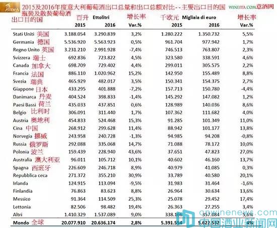 排在意大利出口目的國第二位的德國,2016年意大利葡萄酒進口總量為55.6萬千升,增長0.5%;進口總額為9.78億歐元,增長1.7%。