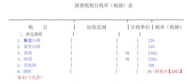 2001年5月11日,財稅〔2001〕84號文件規定:對糧食白酒、薯類白酒在原按25%、15%征收消費稅的同時再按實際銷售量每公斤(1000克)征收0。5元的定額消費稅,同時停止執行外購或委托加工已稅酒和酒精生產的酒抵扣上一生產環節已納消費稅的政策。