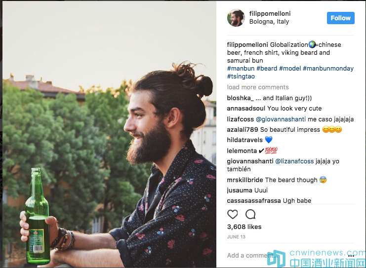 “Globalization=Chinese beer,F(xiàn)rench shirt,Viking beard and samurai bun”(全球化=中國啤酒,法國襯衫,維京胡子和日本發(fā)髻)。在照片分享應(yīng)用Instagram上,意大利網(wǎng)友filippomelloni剛“po出”在自家陽臺與青島啤酒的親密照,瞬間“驚艷”朋友圈,收到好友3000多個好友點贊……