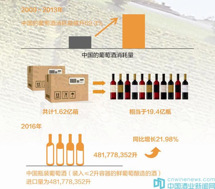 2009~2013年,中國(guó)的葡萄酒消耗量飆升69.3%,共計(jì)1.62億箱,相當(dāng)于19.4億瓶。2013年,全年人均葡萄酒消耗量達(dá)到1.4公升。2009~2013年,法國(guó)葡萄酒進(jìn)口至中國(guó)的總量大增3倍。