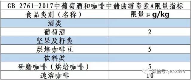 歐洲食品中赭曲霉毒素A風險評估報告曾指出,人類攝入赭曲霉毒素A主要來自谷物,其次是葡萄酒和咖啡等。為此,國家衛計委結合我國葡萄酒和咖啡中赭曲霉毒素A污染及產品消費量情況,對我國葡萄酒和咖啡中赭曲霉毒素A的暴露風險進行了評估。根據風險評估結果,新的GB2761中增加了葡萄酒和咖啡中赭曲霉毒素A限量要求。
