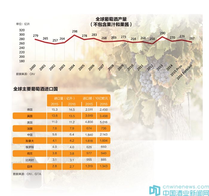 2016年,全球葡萄酒產(chǎn)量(不包括果汁和果醬)為267億升,比2015年減少了930千升。