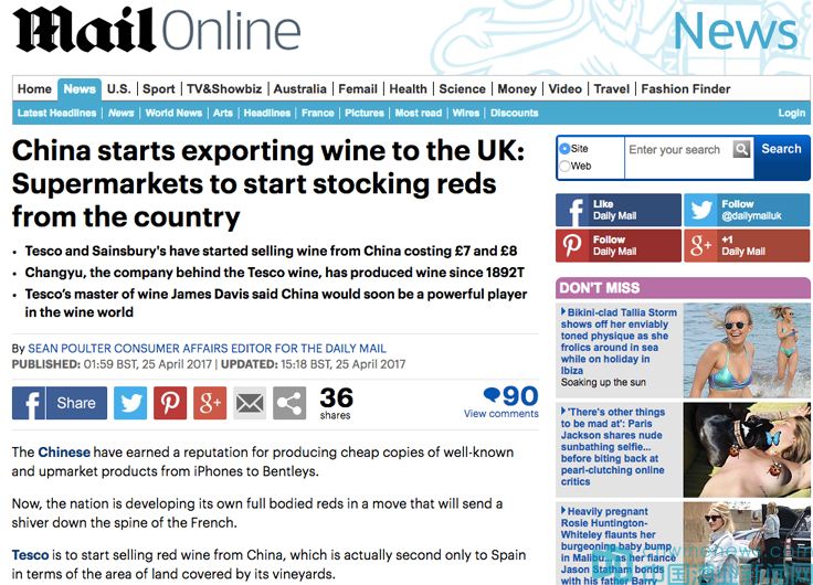 此前,英國《每日郵報(bào)》(The Daily Mail)就發(fā)表題為《中國開始向英國出口葡萄酒》的報(bào)道,文章稱,繼張?jiān)=獍偌{干紅早前已進(jìn)入Sainsbury’s銷售之后,全球第三大超市集團(tuán)Tesco(樂購)也開始銷售張?jiān)Dθ麪柺迨谰魄f2015年份摩塞爾傳奇赤霞珠干紅,這也是唯一一款在TESCO銷售的中國葡萄酒。