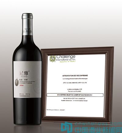 尼雅2014年份粒選赤霞珠干紅葡萄酒獲布萊堡國(guó)際葡萄酒挑戰(zhàn)賽(Challenge International du Vin)金獎(jiǎng)