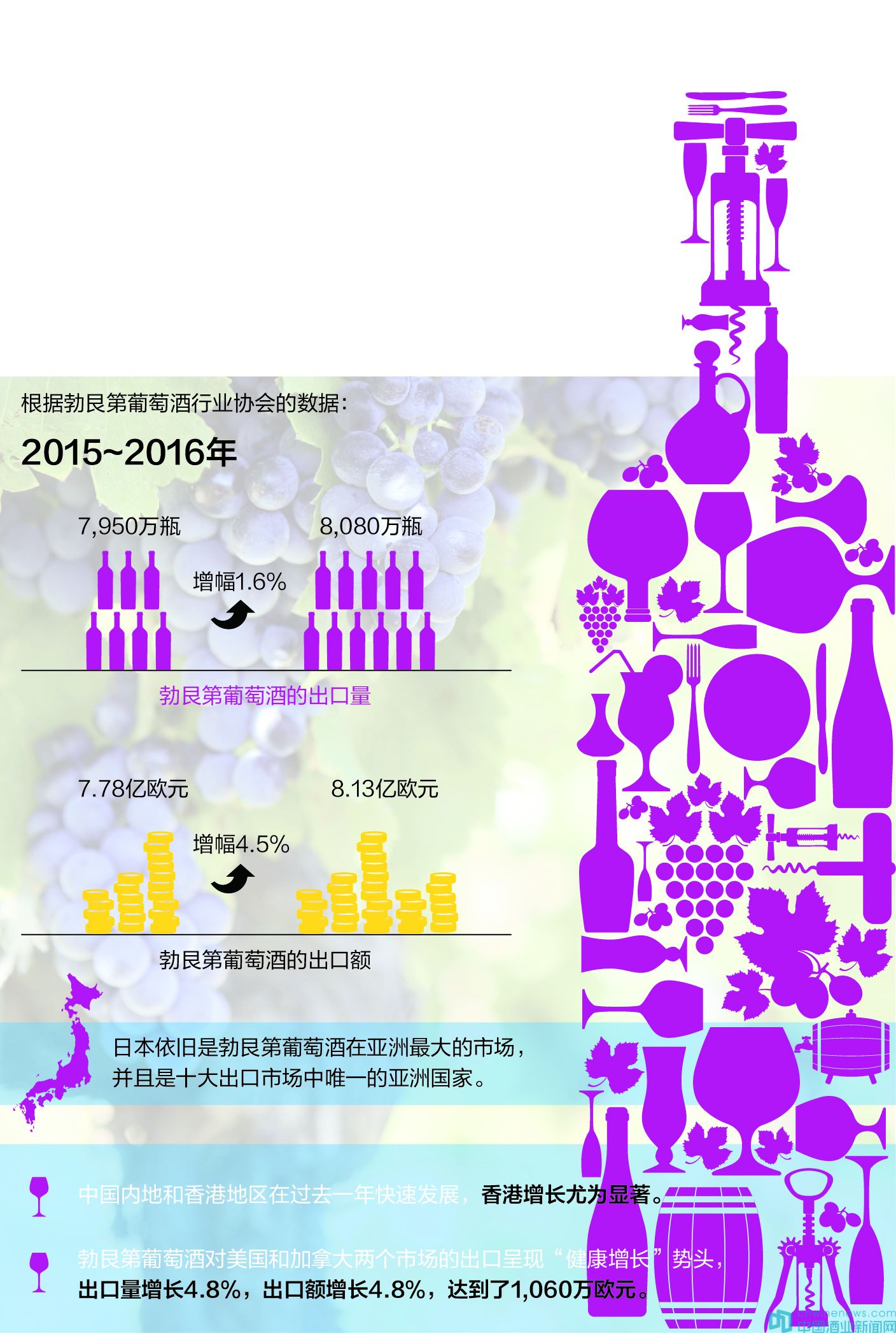 勃艮第葡萄酒對美國和加拿大兩個市場的出口呈現“健康增長”勢頭,出口量增長4.8%,出口額增長4.8%,達到了1,060萬歐元。
