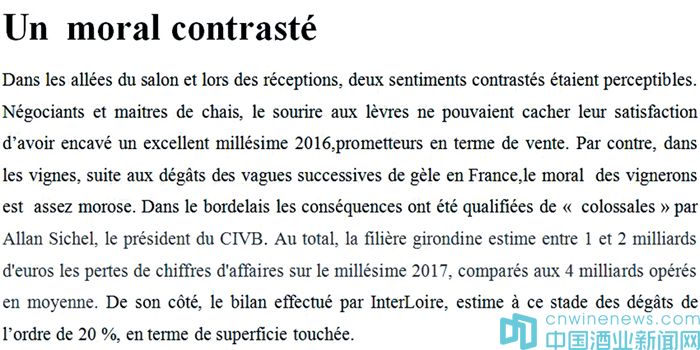 總體來看,僅吉倫特產(chǎn)區(qū),預計2017年年份酒的銷售額將會有10億~20億歐元的滑坡,這是相對于上一年平均40億歐元的銷售額而言。而InterLoir的分析數(shù)據(jù)則顯示冰災所造成的損害波及了20%的葡萄園。