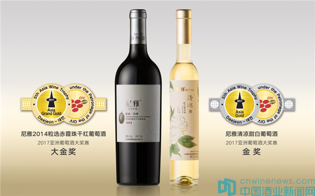 中信國安葡萄酒業作為中國新疆天山北麓生態產區的代表企業,旗下尼雅2014年份粒選赤霞珠干紅葡萄酒和尼雅清涼甜白葡萄酒不僅連獲兩枚金牌,尼雅2014年份粒選赤霞珠干紅葡萄酒更是摘得全球僅有27枚、中國僅有2枚的大金獎一枚。
