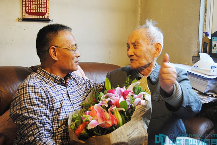已經109歲的老人端坐在沙發上,臉色紅潤,精神矍鑠。見到華夏酒報、中國酒業新聞網同仁一行,老人親切地讓坐,讓家人端來茶水、點心,與韓總編親切聊天。