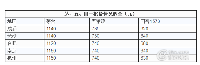 對于目前的茅臺、五糧液、國窖1573價格,糖酒快訊記者對成都、長沙、合肥、南京、杭州五地進(jìn)行了調(diào)查。
