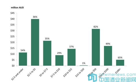 離岸價格區間為20至50澳元每升的葡萄酒出口額增長最為迅猛,增長幅度高達82%,增長額名列第二。價格超過100澳元每升的葡萄酒增長幅度緊隨其后,為65%。