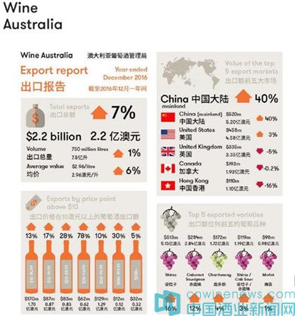 截止到2016年12月底的一年內,澳大利亞葡萄酒對中國大陸出口額增長了40%至5.2億澳元,再創歷史新高,出口量則增長了45%至0.99億升。澳大利亞葡萄酒對中國大陸的出口額占據了對全亞洲出口額的59%。