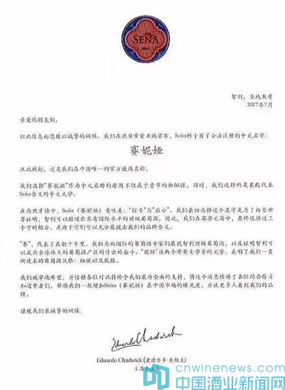 2017年7月,不少中國的葡萄酒經銷商收到一封來自Seña的電子函件。函件稱:我們在此非常榮幸地宣布,Seña終于有了合法注冊的中文名字:賽妮婭。從此刻起,這是我們在中國唯一的官方使用名稱。
