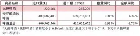 啤酒方面,報(bào)告期內(nèi)進(jìn)口啤酒量額小幅上行,進(jìn)口總量為4.0億升,同比增長(zhǎng)6.9%,進(jìn)口額4.1億美元,同比增長(zhǎng)6.8%。