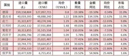 其中葡萄酒與啤酒延續(xù)小幅增長(zhǎng),烈酒得益于白蘭地的強(qiáng)勢(shì)表現(xiàn)保持了較大增幅,白蘭地同期進(jìn)口額為3.9億美元(約占烈酒進(jìn)口額73.6%),同比增長(zhǎng)25.1%,在各進(jìn)口酒類中排名僅次于原瓶裝葡萄酒和啤酒。