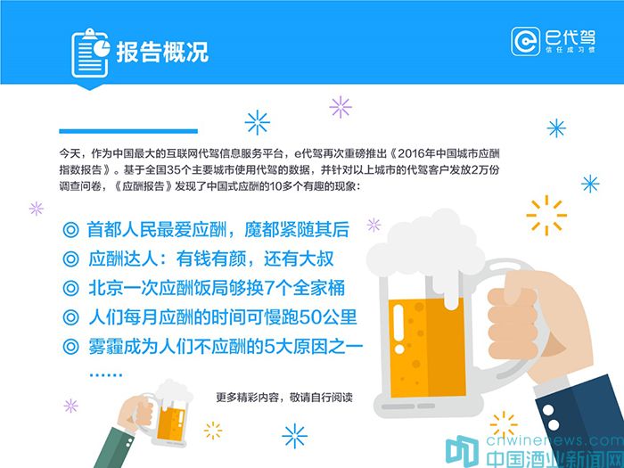 近日,國(guó)內(nèi)代駕信息服務(wù)平臺(tái)e代駕發(fā)布了《2016中國(guó)城市應(yīng)酬指數(shù)報(bào)告》(以下簡(jiǎn)稱“《應(yīng)酬報(bào)告》”),借助數(shù)據(jù)平臺(tái)對(duì)國(guó)內(nèi)主要城市的“應(yīng)酬文化”進(jìn)行了深入研究,從地域分布、收入狀況、消費(fèi)行為等多個(gè)方面用數(shù)據(jù)刻畫(huà)了當(dāng)前國(guó)人關(guān)于應(yīng)酬方面的有關(guān)狀況。據(jù)了解,《應(yīng)酬報(bào)告》基于全國(guó)35個(gè)主要城市的代駕大數(shù)據(jù),并針對(duì)以上城市發(fā)放2萬(wàn)份調(diào)查問(wèn)卷(收回有效問(wèn)卷17953份)。