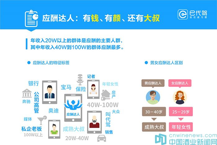 《應(yīng)酬報(bào)告》發(fā)現(xiàn),從應(yīng)酬主要人群的收入情況來(lái)看,各城市的中產(chǎn)階級(jí)是應(yīng)酬的主要人群。總體上看,年收入20萬(wàn)以上的群體是應(yīng)酬的主要人群,其中年收入在40萬(wàn)到100萬(wàn)的群體應(yīng)酬最多。從性別來(lái)看,30至40歲的成熟男性和25至29歲的年輕女性是應(yīng)酬的主要人群。此外,應(yīng)酬主要人群多為私企老板或公司高管,以及來(lái)自銀行、保險(xiǎn)、房地產(chǎn)等行業(yè)。