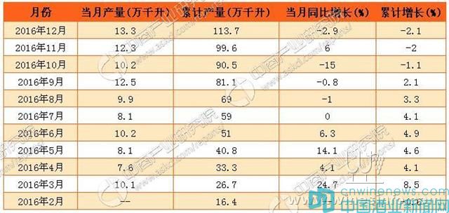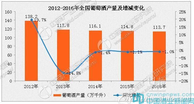 2016年全國葡萄酒產(chǎn)量為113.7萬升,較上一年減少1.0%。葡萄酒產(chǎn)量為連續(xù)第4年減少。