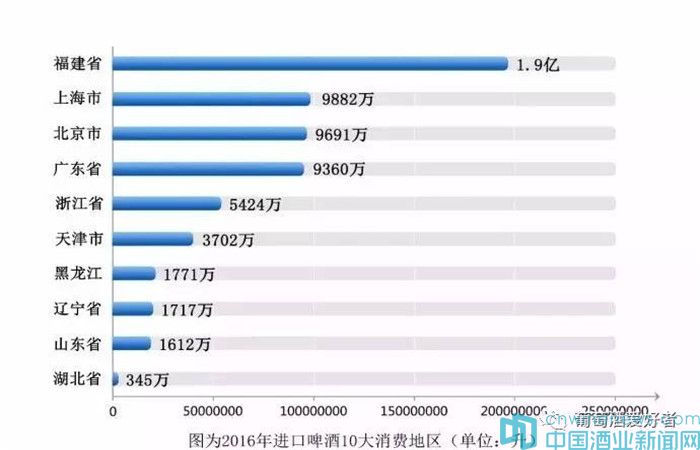 2016年,中國進口啤酒消費量最高的地區為福建省,消費總量約為1.96億升,比排在第二位的上海市高出近1倍,排在第二、三、四位的上海、北京和廣東消費量差距不大。